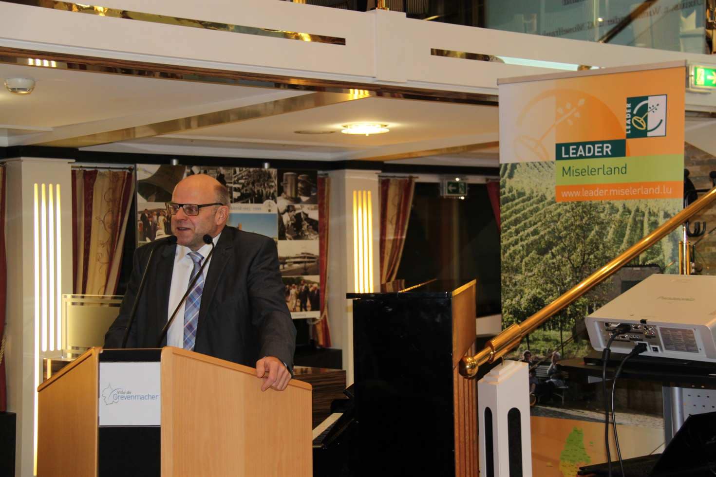 Der Vorsitzende der Lokalen Aktionsgruppe LEADER Moselfranken, Jürgen Dixius und der Präsident der LAG LEADER Miselerland, Marc Weyer konnten sich über die Präsenz zahlreicher Gäste aus den beiden LEADER-Gebieten, die zusammen nun die erste transnationale LEADER-Region Europas bilden, freuen.